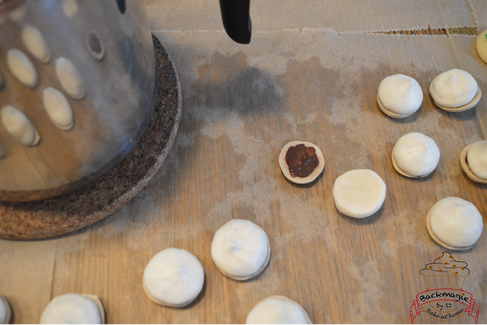 Die Innenseiten der Hälfte der Tupfen mit der Schokolade bestreichen und die andere Hälfte darauf kleben. Trocknen lassen.