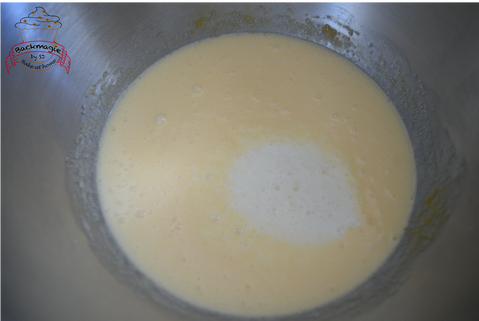 In einer zweiten Schüssel Zucker und Butter schaumig rühren. Eier hinzugeben und weiter rühren.