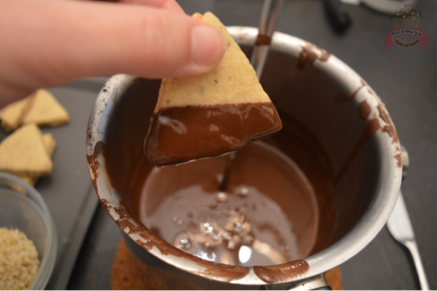 Zartbitterkuvertüre im Wasserbad schmelzen. Die Kekse zu einem Drittel eintunken und sofort mit den gehackten Haselnüssen dekorieren. Trocknen lassen.