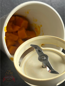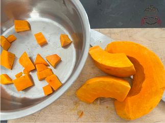 In einem kleinen Topf den gewürfelten Kürbis mit etwas Wasser weich kochen. Mit einem Pürierstab pürieren.